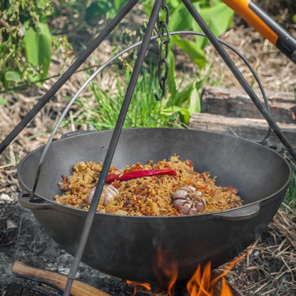 Казан татарский чугунный диаметром 36 см. и объемом 8 л. Изготовлен из высококачественного литого чугуна, благодаря чему обеспечивает абсолютно равномерный нагрев со всех сторон и надолго сохраняет тепло. Благодяря удобному подвесу идеально подходит для готовки блюд на мангале или костре.