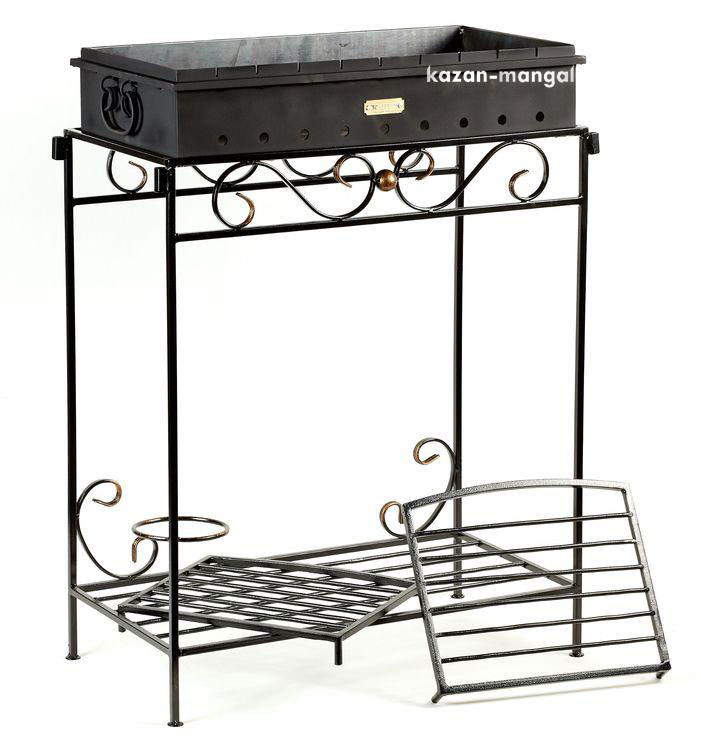 В нижней части жаровни имеются отверстия для обеспечения хорошей тяги. В комплект входят две съёмных полки, устанавливаемых по краем мангала, которые делают процесс приготовления наиболее комфортным. Нижняя полка прекрасно подходит для хранения дров. Манагал выкрашен жаростойкой краской.