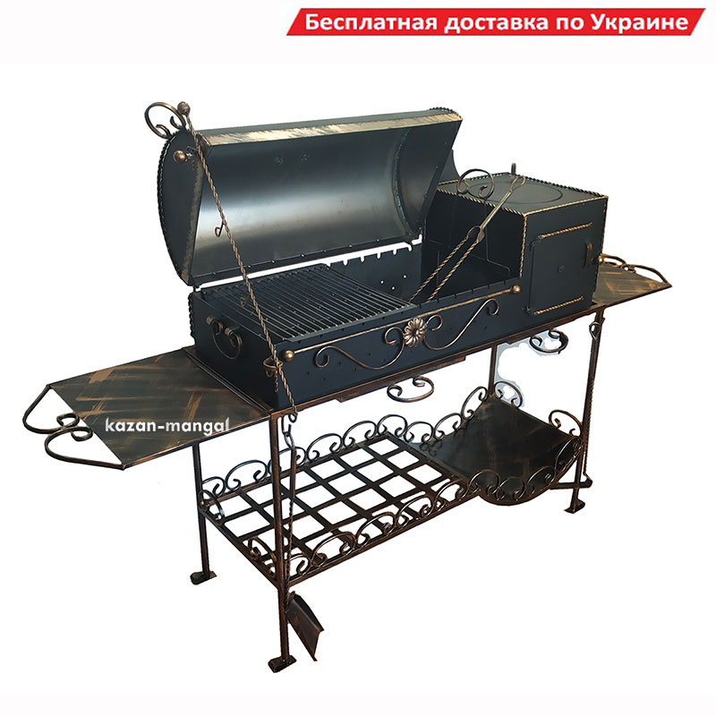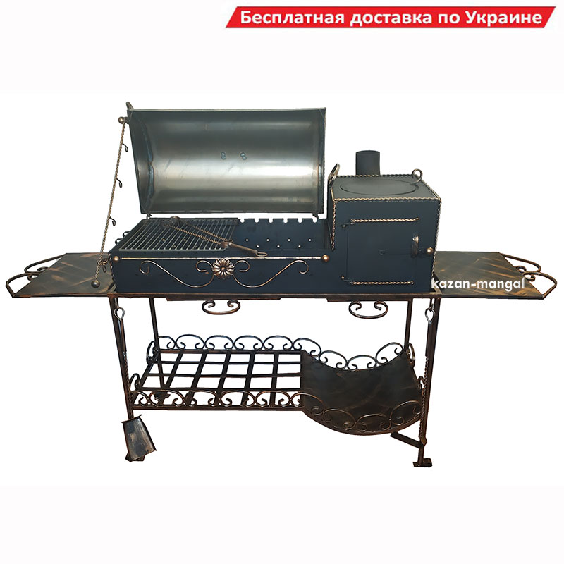 Зверху знаходиться конфорка під казан. Мангал має відкидну кришку, що дозволяє використовати його в якості гриля, не тільки смажити, але й запікати, тушити. Кришка комплектується підпором для фіксації в чотирьох положеннях.