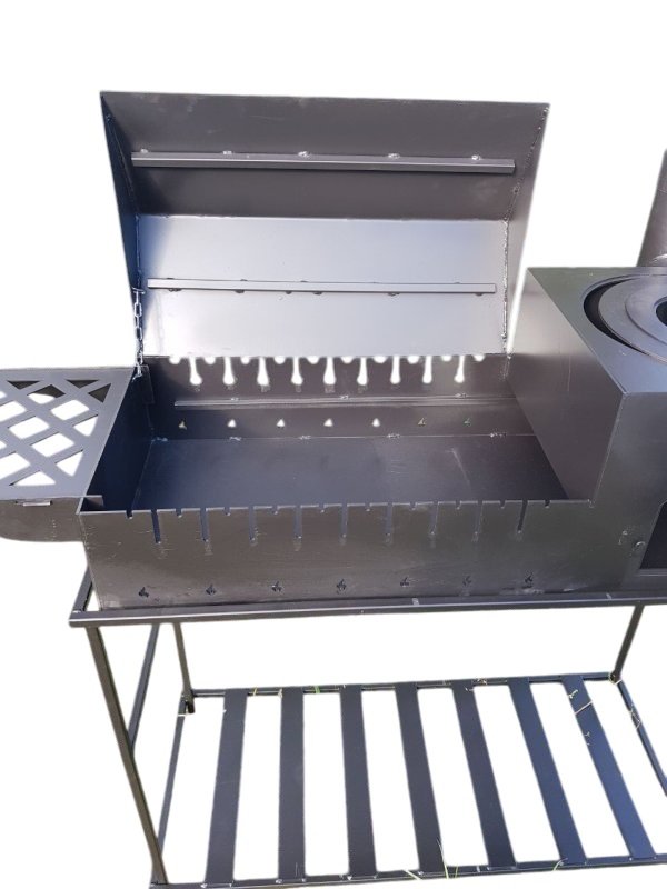 Мангал з пічкою табоковим столиком має довжину 135 та ширину 38 см. Розрахований на 10 шампурів. Поєднує в собі якості звичайного мангалу та грилю.