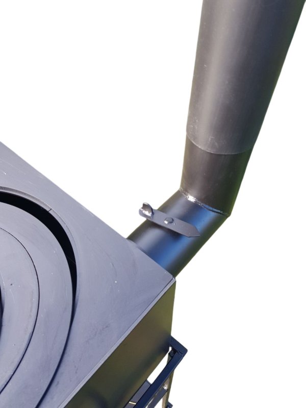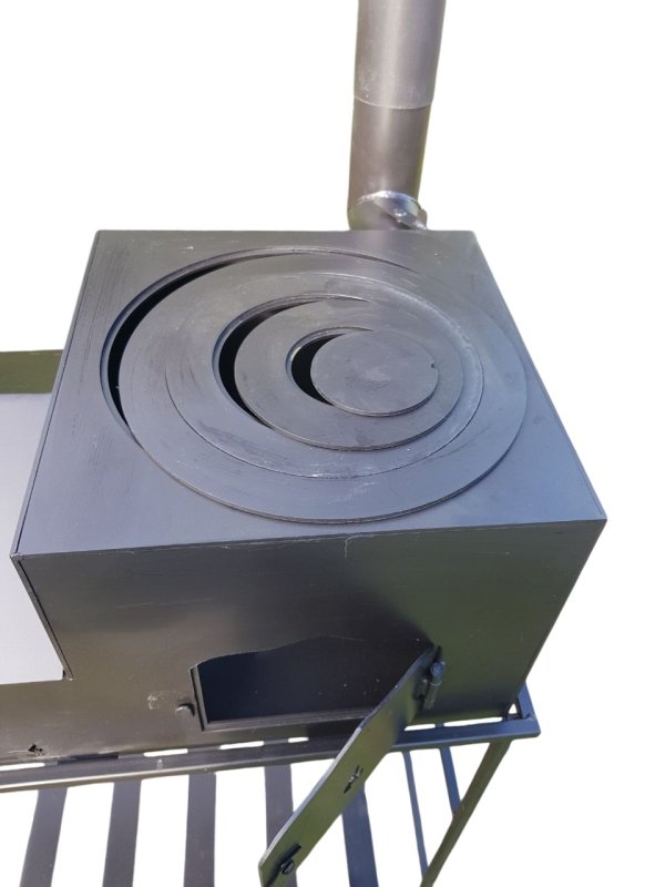 Зверху знаходиться конфорка, що має кілька для кілець для регулювання необхідного Вам діаметру отвору під будь-який казан. В пічку встановлений димохід з вбудованим шибером для регулювання протягу. В нижній частині жаровні також знаходяться отвори для забезпечення тяги.