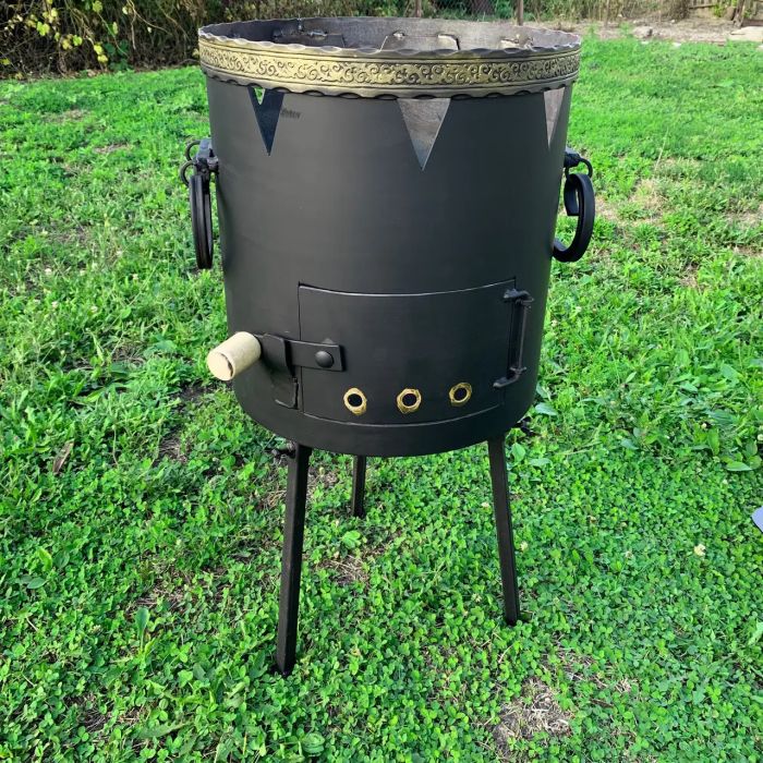 Печь под казан имеет разборные ножки, благодаря чему доставка транспортной компанией не будет стоить дорого. Выкрашена жаропрочной краской. Дверцы для закладки дров имеют ненагревающуюся ручку, пользоваться ими легко и безопасно. Также дверцы имеют отверстия для формирования постоянной тяги. Прочные ручки по бокам позволят с легкостью установить печку на подходящее место на вашем участке.
