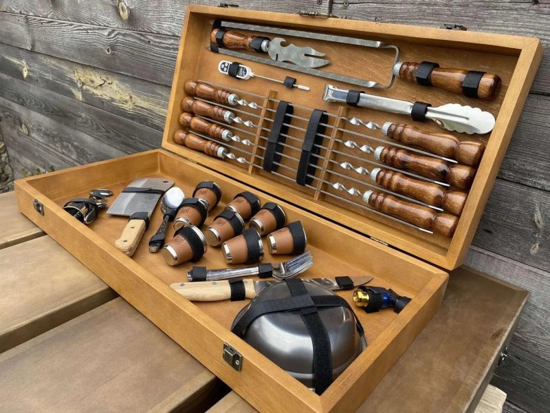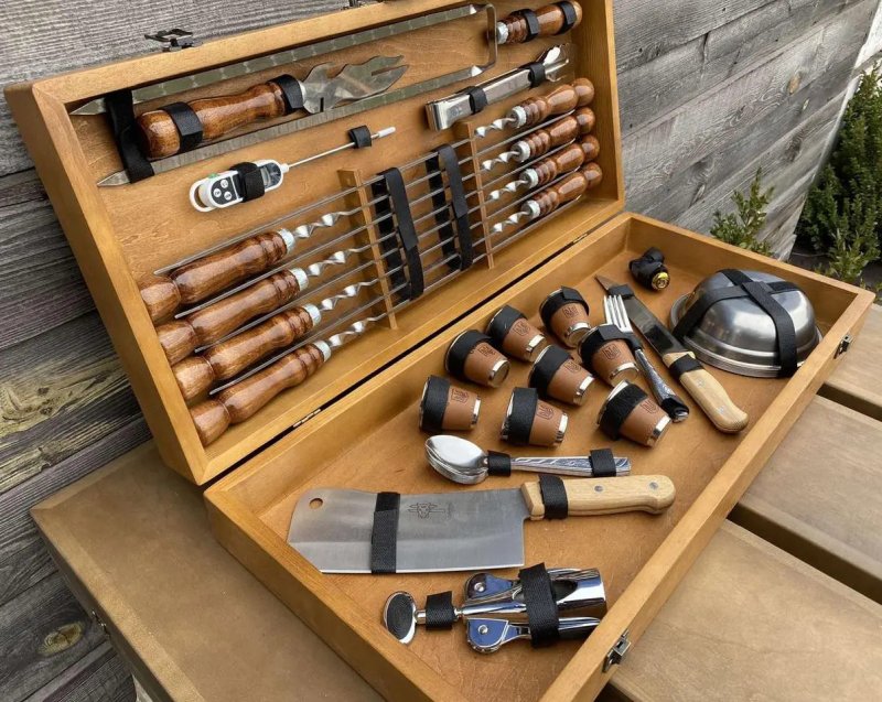 Набор рассчитан на 8 персон, имеет самую полную комплектацию и включает в себя все необходимое для приготовления любимых блюд на мангале. Упакован в подарочный кейс из натурального дерева. Подарочный набор шампуров в кейсе "Рысь" станет прекрасным и эффектным подарком для своего обладателя.