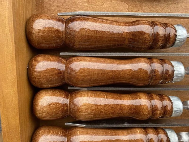 Шампура выполнены из стали толщиной 3 мм, обладают большим запасом прочности, не гнутся и выдерживают любые порции мяса, имеют длину в 63 см., чего достаточно для самого большого мангала. Рукоятки инструментов изготовлены из натурального дерева, работать ими удобно и приятно.