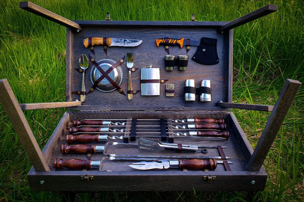 Набор рассчитан на 6 персон, включает в себя все необходимое для комфортного отдыха на природе. Упакован в подарочный кейс из натурального дерева, оборудованный ножками, благодаря чему может служить удобным и прочным столом при выезде на природу. Подарочный набор шампуров в кейсе "Гетьман" станет прекрасным и эффектным подарком для своего обладателя.