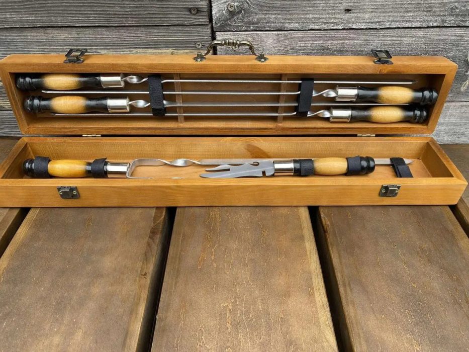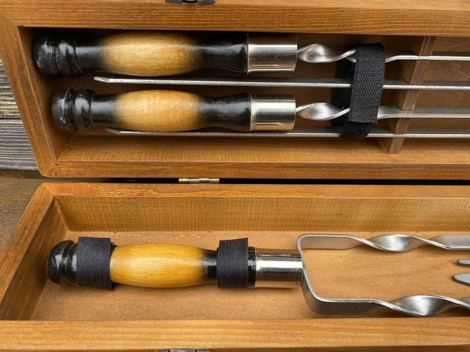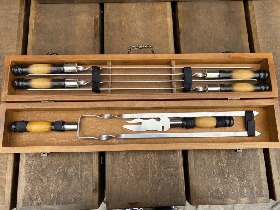 Шампура выполнены из стали толщиной 3 мм, обладают большим запасом прочности, не гнутся и выдерживают любые порции мяса, имеют длину в 63 см., чего достаточно для самого большого мангала. Рукоятки инструментов изготовлены из натурального дерева, работать ими удобно и приятно.