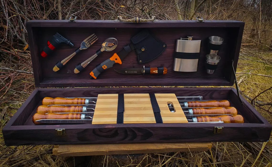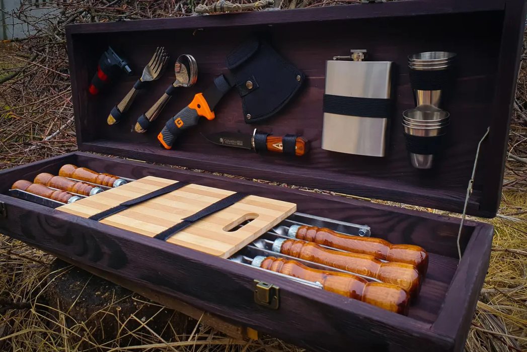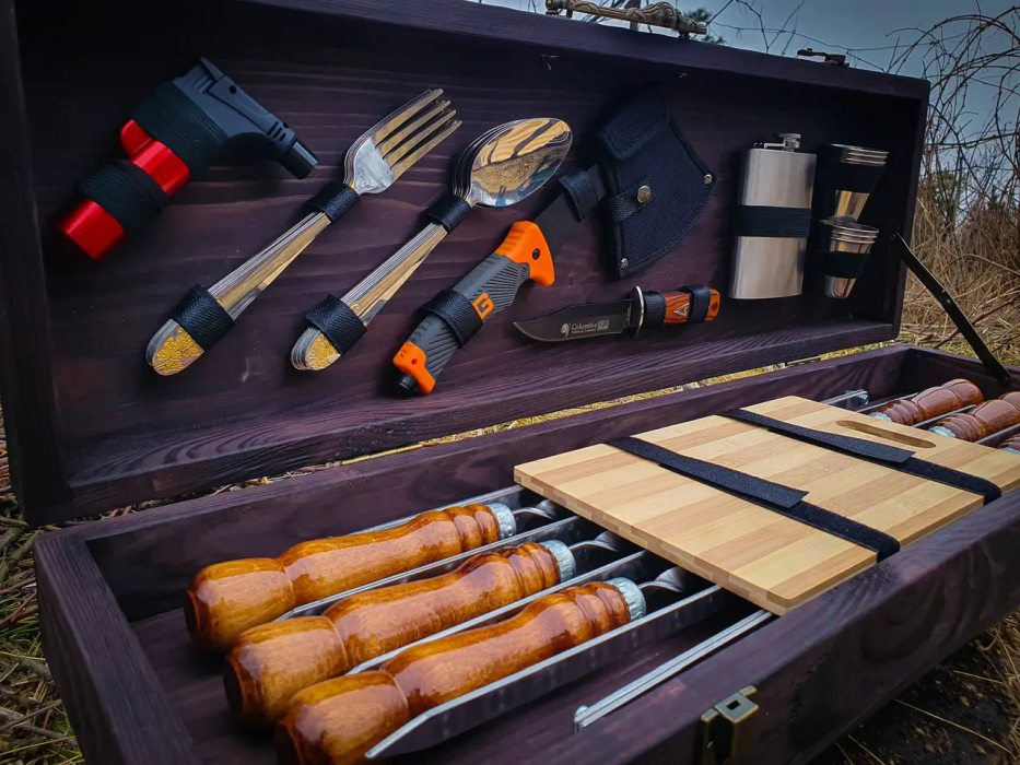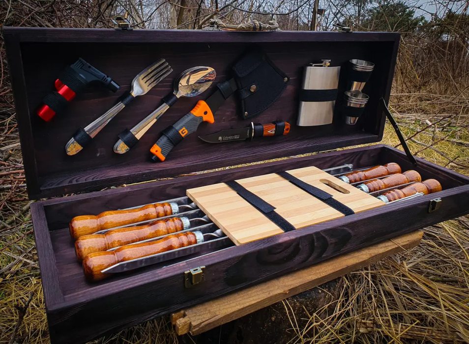 Набір розрахований на 6 персон, включає все необхідне для комфортного відпочинку на природі. Запакований у подарунковий кейс із натурального дерева, завдяки чому подарунковий набір шампурів у кейсі "Кошовий" стане чудовим та ефектним подарунком для свого власника.