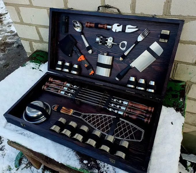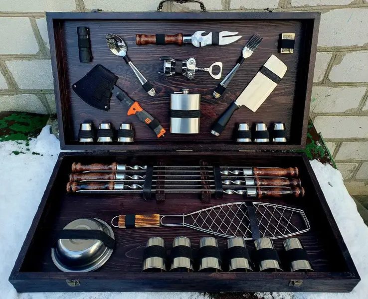 Набір розрахований на 6 персон, включає все необхідне для комфортного відпочинку на природі. Запакований у подарунковий кейс із натурального дерева, завдяки чому подарунковий набір шампурів у кейсі "Осавул" стане чудовим та ефектним подарунком для свого власника.