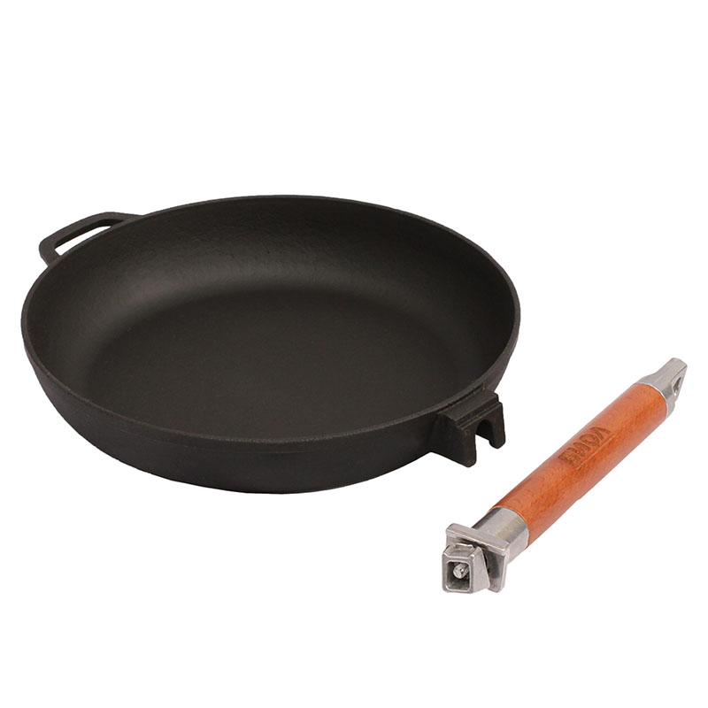 Сковорода диаметром 26 см. Изготовлена из высококачественного литого чугуна, благодаря чему обеспечивает равномерный нагрев и надолго сохраняет тепло. Подходит как для использования на костре, так и для всех типов плит. Укомплектована съемной ручкой из натурального дерева. Упакована в фирменную подарочную упаковку.