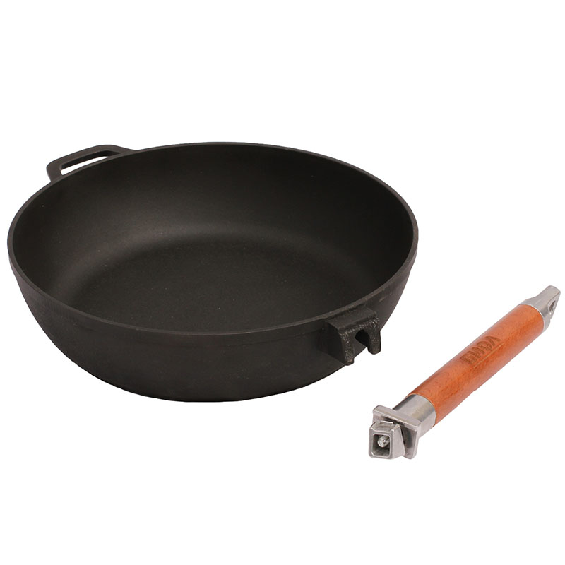 Сковорода диаметром 28 см. Изготовлена из высококачественного литого чугуна, благодаря чему обеспечивает равномерный нагрев и надолго сохраняет тепло. Подходит как для использования на костре, так и для всех типов плит. Укомплектована съемной ручкой из натурального дерева. Упакована в фирменную подарочную упаковку.