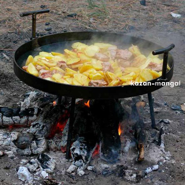Сковорода диаметром 400 мм. изготовлена из диска бороны толщиной 4 мм., Благодаря такой толщине обеспечивается равномерное распределение температуры по всей поверхности. Для удобства пользования сковорода имеет вертикальный бортик высотой 30 мм. В комплект входят съёмные ножки и рукоятки. В разобранном состоянии занимает минимум места, что очень удобно при транспортировке.