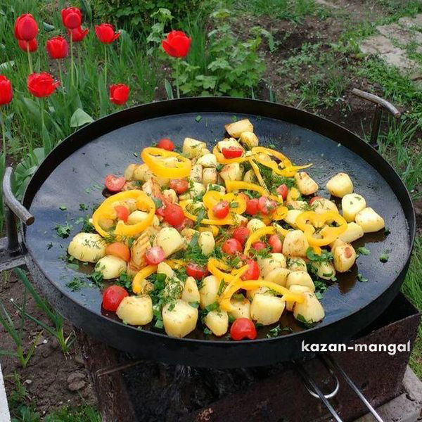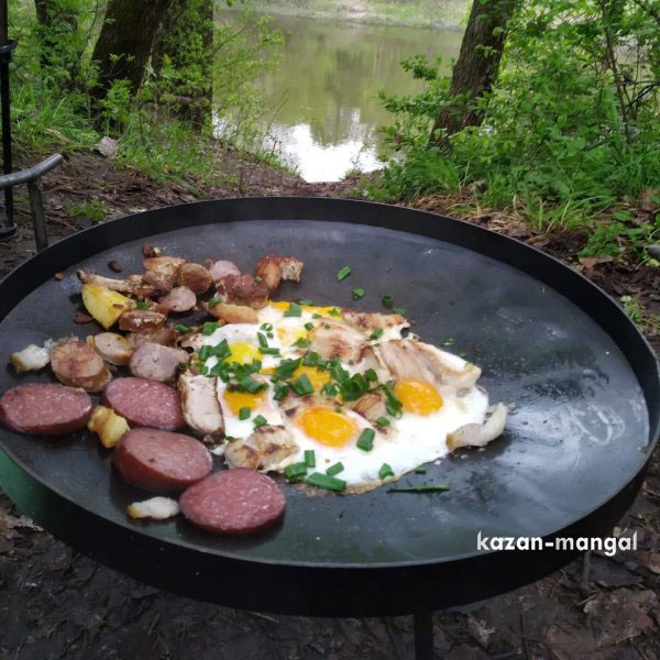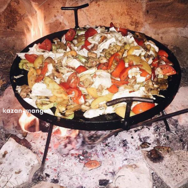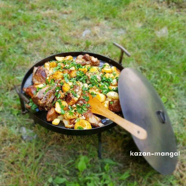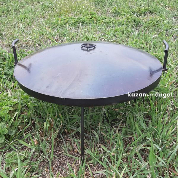 Сковорода диаметром 600 мм. изготовлена из диска бороны толщиной 4 мм., Благодаря такой толщине обеспечивается равномерное распределение температуры по всей поверхности. Для удобства пользования сковорода имеет вертикальный бортик высотой 30 мм. Сковорода комплектуется удобной крышкой. В комплект также входят съёмные ножки и рукоятки. В разобранном состоянии занимает минимум места, что очень при транспортировке.