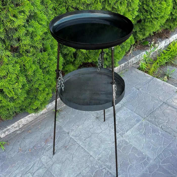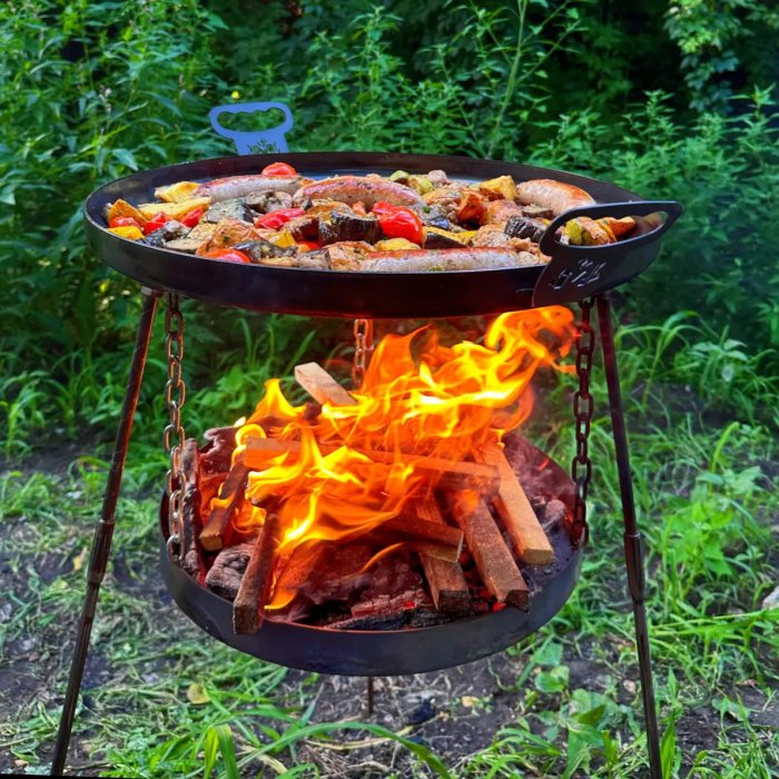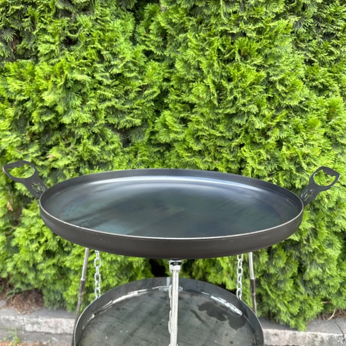 Сковорода з диска артикул 30044 діаметром 40 см. Укомплектована підвісом для вогню, що вбереже газон, дерев'яну чи кам'яну підлогу на вашому подвір'ї. Підвіс надійно тримається на міцних ланцюгах. Весь комплект встановлюється на високих ніжкаж, завдяки чому і сковорідка і підвіс знаходяться на зручній для використання висоті.