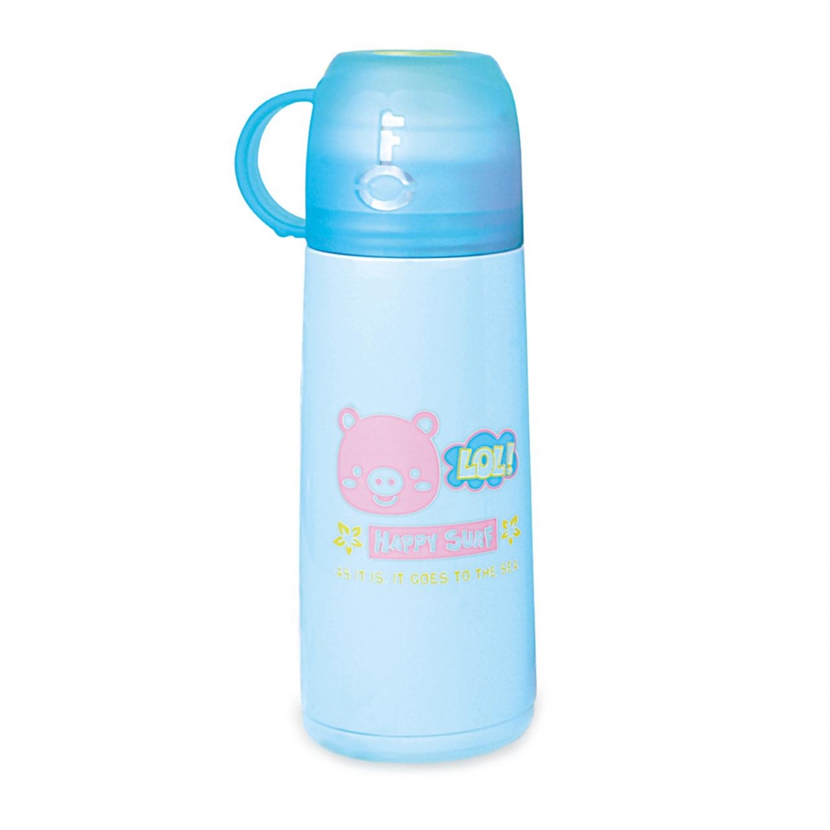 Термос FISSMAN Свинка артикул VA-9676.500 объемом 0,5 л. И колба, и корпус термоса изготовлены из пищевой нержавеющей стали 18/10. Такая сталь экологически безопасна, она не окисляется, не передает продуктам металлический вкус или запах. Термос из нержавеющей стали надежен и долговечен, прекрасно подходит для личного использования ребенком. Благодаря наличию вакуума между стенками термоса, обеспечивается продолжительная многочасовая термоизоляция вашего напитка. Из крышки в форме чашки с ручкой удобно пить гарячий напиток. Выполнен в голубом цвете с изображением веселой свинки.